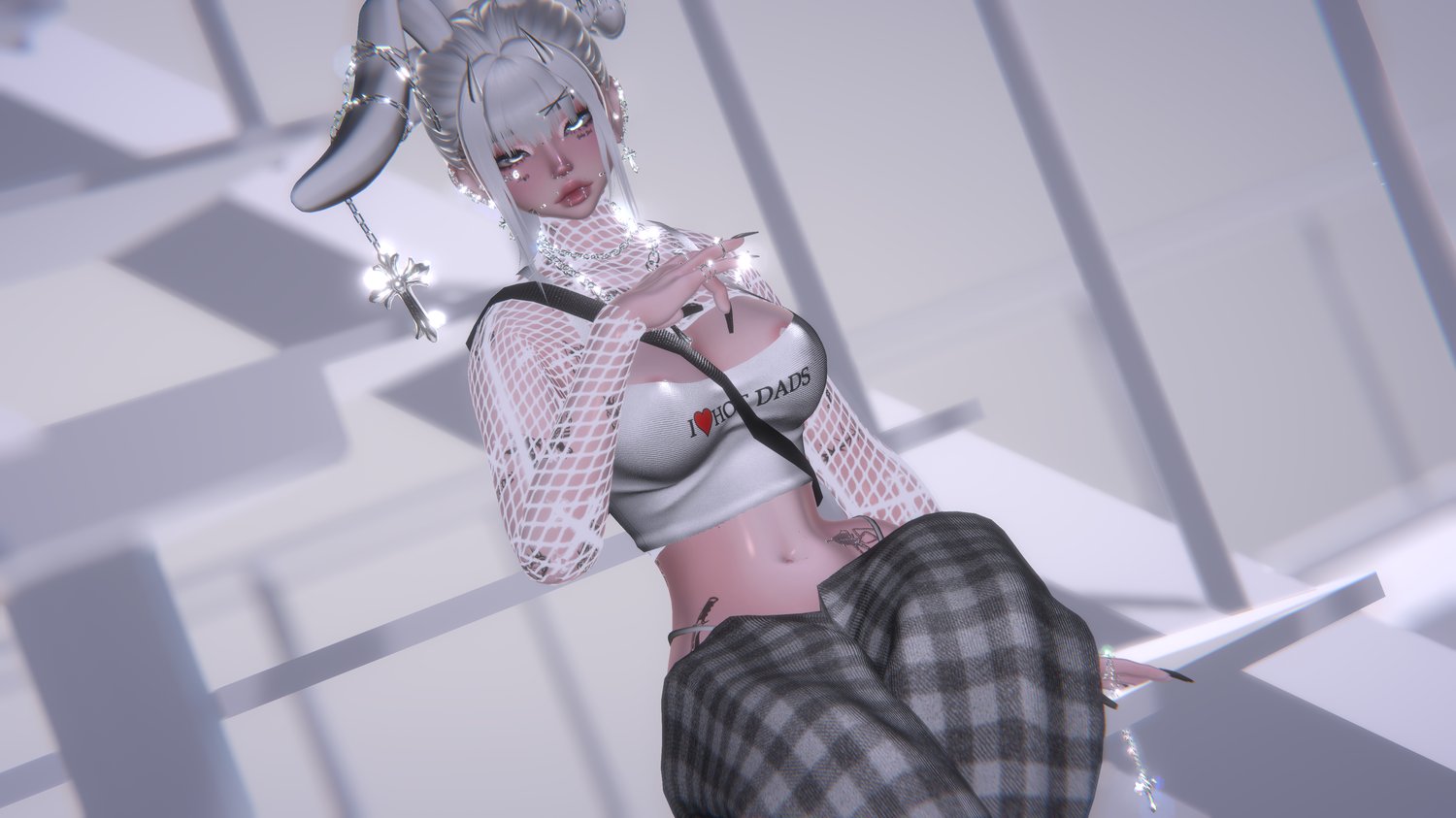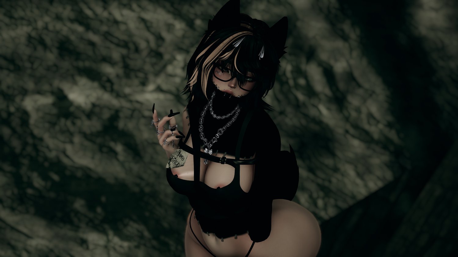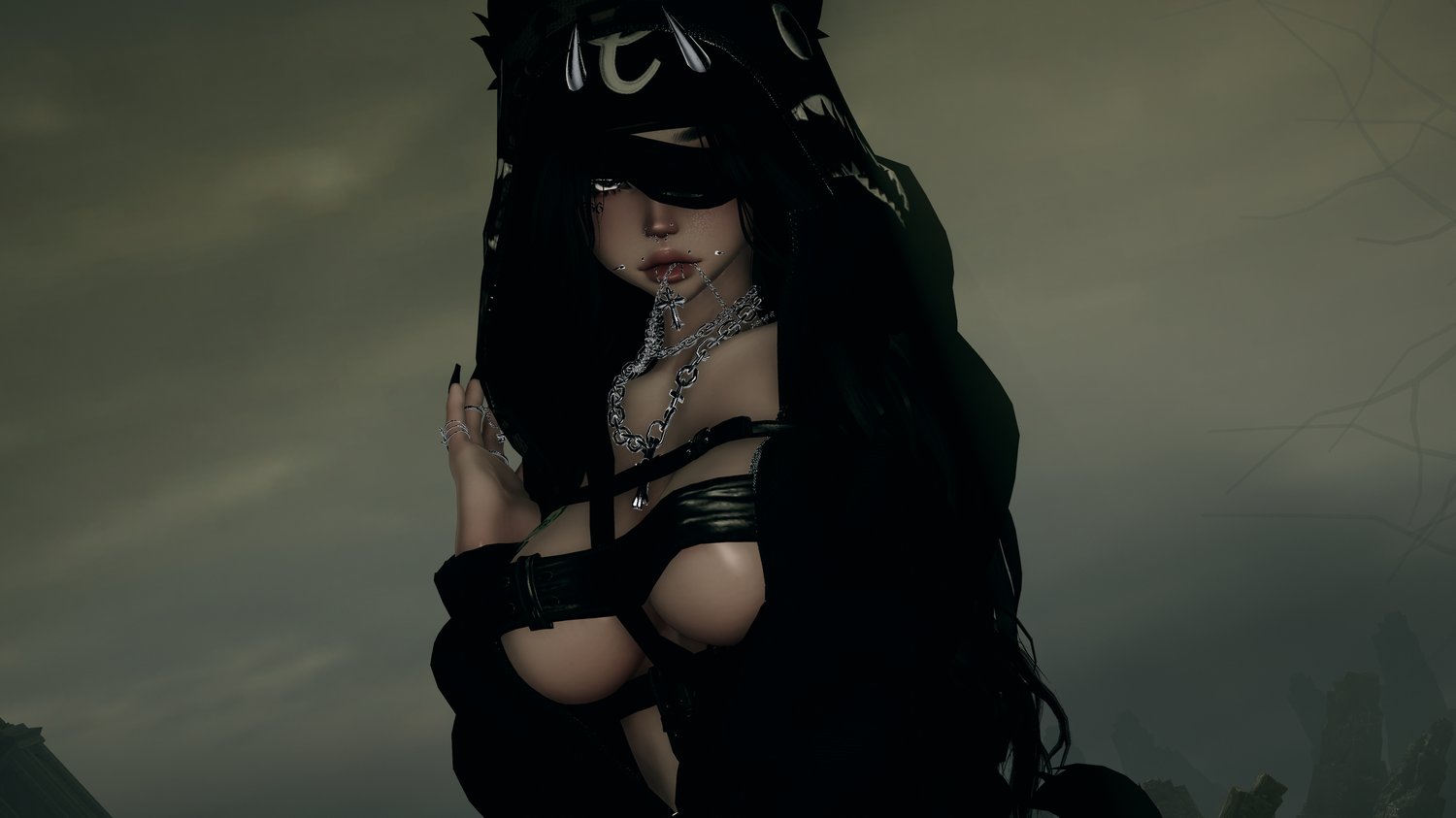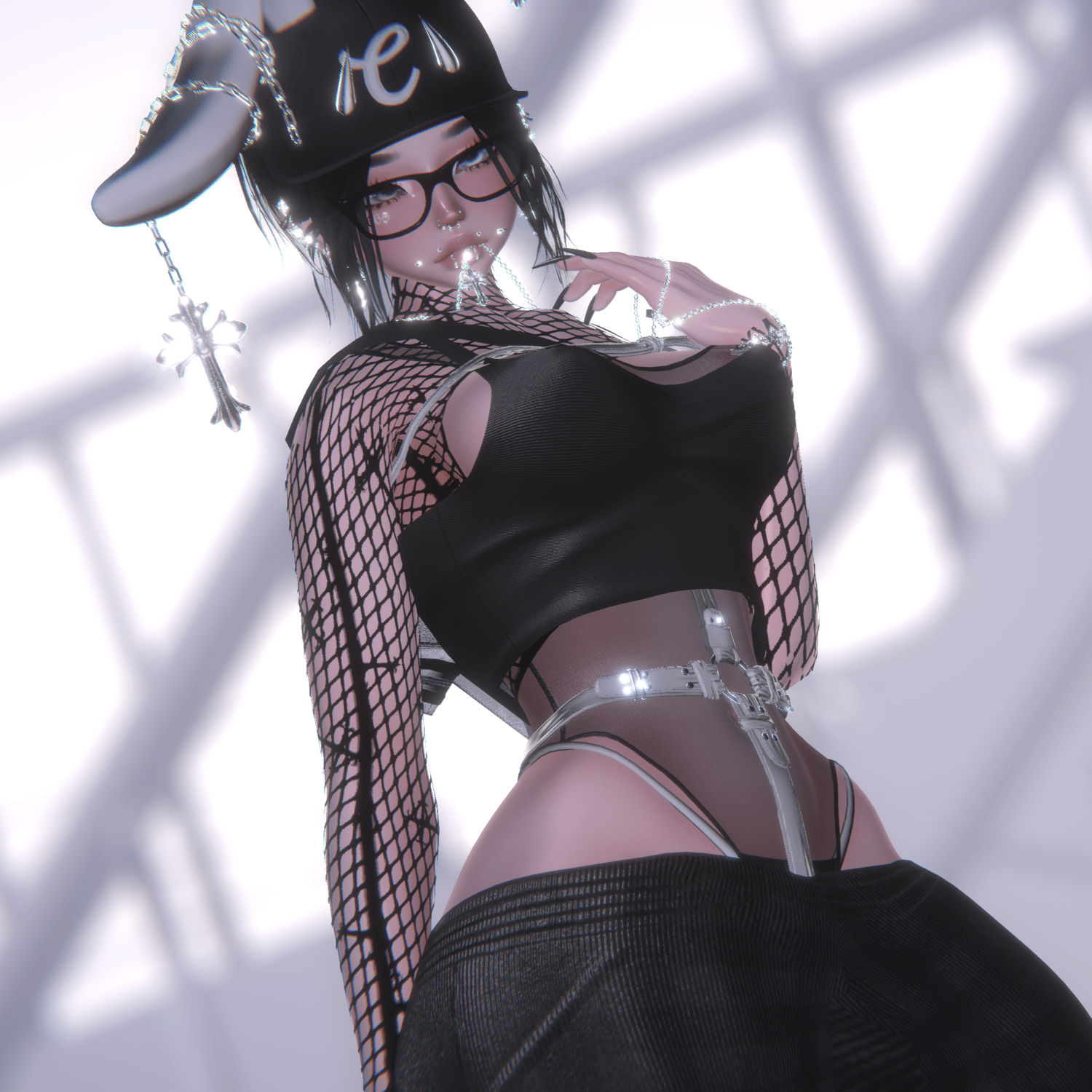 Mouth Chain, Ushanka, j4S, Heels, Fishnet, Fluff Midlength, Hair Long, Hair Buns, Fluffy Bun, Blindfold, Earrings, Rings, Nayao's Chain, BB Belt, Bunny Ears, Hand Chain, Bodysuit, Oversized T Shirt,